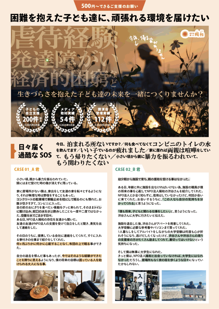 虐待など、家庭の事情により、親を頼る事ができない子どもたちが、今も助けを求めています。
